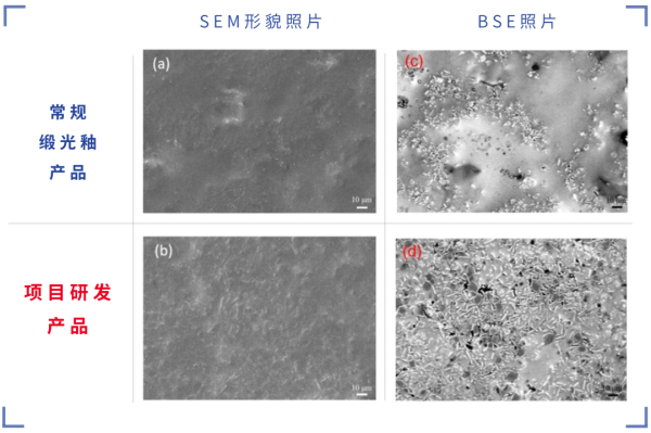 項(xiàng)目產(chǎn)品與常規(guī)緞光釉產(chǎn)品的電子顯微鏡(SEM)形貌與背散射電子(BSE)圖像對(duì)比。